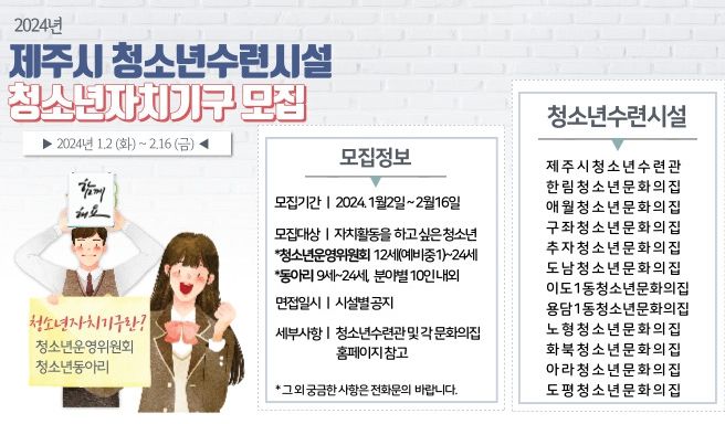 [제주교통복지신문 김현석 기자] 제주시는 2024년 청소년수련시설 자치기구인 청소년운영위원회 위원과 동아리 회원을 2월 16일까지 모집한다.