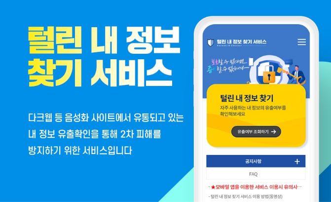 ‘털린 내 정보 찾기’ 서비스는 이용자가 평소 온라인 상에서 사용하는 계정정보(아이디, 암호)를 입력하면, 해당 정보가 다크웹 등 음성화 사이트에서 불법유통 됐는지 확인할 수 있는 서비스이다.