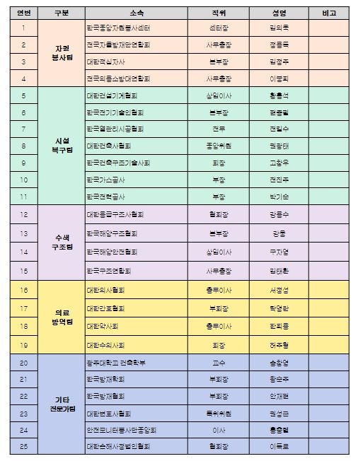 민간위원은 재난 현장에서 실제로 협업·지원이 가능한 단체·협회를 중심으로 자원봉사팀, 시설복구팀 등 현장 협업 기능별로 균형있게 위촉됐으며, 이상민 장관이 직접 위촉장을 수여했다.