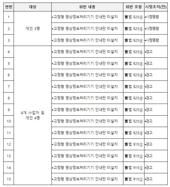 이번 의결에서는, 조사가 완료될 때까지 안내판 부착 조치를 취하지 않은 3명의 개인에게는 시정명령을 처분했으나, 조사 과정에서 안내판 부착 조치를 자진해서 완료한 12개 사업자 및 개인에게는 경고 조치만 하기로 했다.
