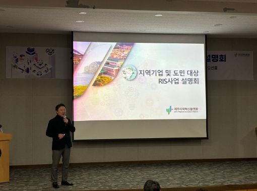 지역기업과 도민 등 100여 명이 참석한 가운데 강철웅 제주지역혁신플랫폼 총괄운영센터장(제주대 교수)은 RIS사업의 사업 취지와 추진 방향 등을 설명했다.