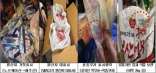 적발된 유형을 보면 노르웨이산 고등어를 제주산으로, 중국산 김치를 국내산으로, 미국산 돼지고기를 국내산으로 허위 표기한 업소가 8곳이었으며, 오징어와 갈치, 돼지고기 등 원산지를 표기하지 않은 업소가 5곳, 중국산 옥두어를 옥돔으로 혼동 표기한 업소가 1곳, 유통기한 위반이 1곳 등이었다.
