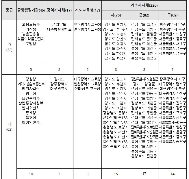 평가는 중앙행정기관, 광역지방자치단체, 교육청, 기초 시·군·구 등 6개 기관유형별로 구분하여 추진됐으며, 상위 10%에 해당하는 32개 기관이 우수기관(가등급)으로 선정됐다.