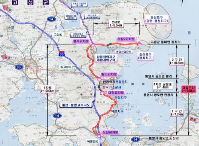 이 도로가 개통되면 한반도 서남해안을 “ㄴ”자로 걸치는 국도77호선의 수송기능이 확대되어 고성-통영 간의 교통정체 해소와 더불어 지역 균형발전에도 크게 기여할 수 있을 것으로 기대된다.