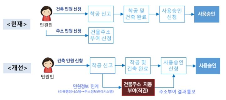 특히, 건물 사용승인(준공)을 신청하기 위해서는 먼저 건물주소를 부여받아야 하는데, 건축주가 이를 알지 못하고 주소 부여 신청을 미리 하지 못하면 사용승인(준공) 신청이 최대 14일 늦어지는 불편이 있었다.