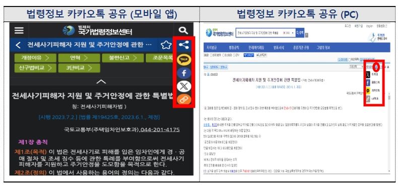 지금까지는 국가법령정보센터의 법령정보를 SNS에 공유하기 위해서는 검색된 법령정보 화면을 캡처하여 SNS에 업로드해야 했으나, 앞으로는 법령정보 화면 위쪽에 있는 아이콘(그림입니다. 원본 그림의 이름: CLP000028980188.bmp 원본 그림의 크기: 가로 69pixel, 세로 67pixel)을 누르면 곧바로 카카오톡 등 SNS로 공유할 수 있다. 공유가 가능한 SNS는 카카오톡, 페이스북, X(구 트위터)이며, 국가법령정보센터 PC 웹 페이지(Web Page)나 모바일 앱(App)에서 모두 가능하다.