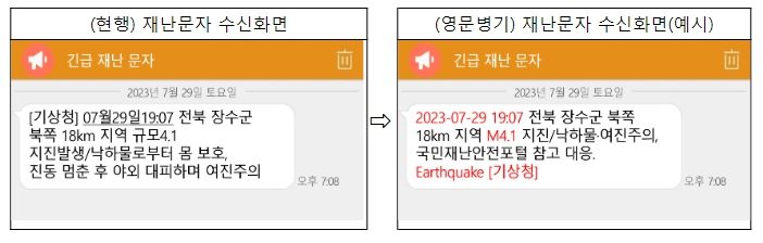 [제주교통복지신문 박상현 기자] 행정안전부와 기상청은 경보음을 동반하는 위급‧긴급 재난문자 발송 시, 재난유형과 지진규모 등 재난발생 핵심정보에 대해 영문 표기를 병행하여 한국어에 능숙하지 않은 외국인들도 재난상황을 쉽게 이해할 수 있도록 표준문안 및 시스템을 개선한다.