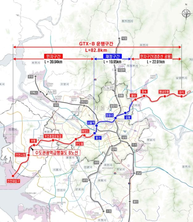 GTX-B는 인천대입구역에서 출발하여 신도림, 여의도, 용산, 서울역, 청량리 등 서울 도심을 지나 경기도 남양주 마석역까지 82.8km를 연결하며, 14개역 모두 일반 지하철로 갈아탈 수 있는 환승역이다.