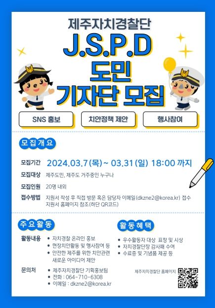 [제주교통복지신문 김현석 기자] 제주특별자치도 자치경찰단은 7일부터 31일까지 자치경찰에 대한 홍보와 치안 정책 아이디어 제시, 치안 캠페인 등 현장활동을 함께 할 ‘J.S.P.D 도민 기자단’을 공개모집한다고 밝혔다.