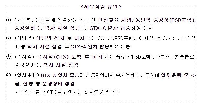 이번 ‘국민참여 안전점검’에서는 일반 국민에게 최초로 공개되는 GTX 수서역사, GTX 성남역사 등 준공역사의 시설을 점검한다. GTX-A 철도차량 시승체험 활동 등 이용객의 안전과 편의사항 점검도 중점 실시한다.