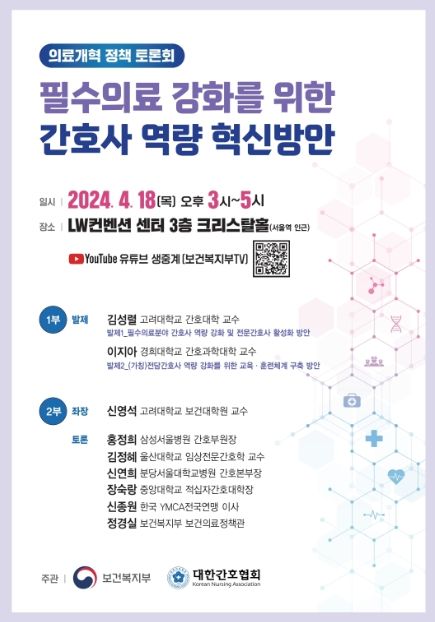 [제주교통복지신문 박상현 기자] 보건복지부는 대한간호협회와 함께 4월 18일 오후 3시, LW 컨벤션(서울 중구)에서 '필수의료 강화를 위한 간호사 역량 혁신방안'을 주제로 토론회를 개최했다.
