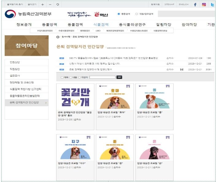 이명헌 검역본부 동물질병관리부장은 “은퇴 검역탐지견을 직접 만나볼 수 있는 이번 행사에 많은 관심을 부탁드린다.”라고 하며, “앞으로도 동물 입양 문화 활성화와 동물복지 증진을 위해 노력하겠다.”라고 말했다.