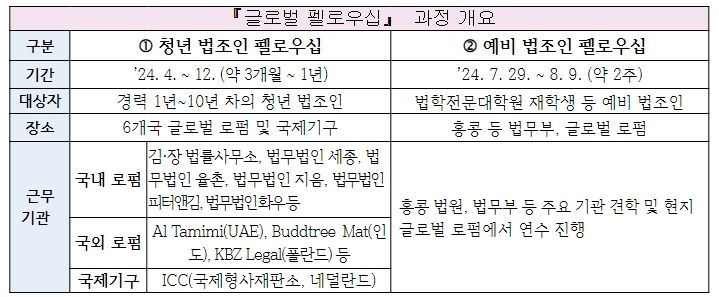 [제주교통복지신문 박상현 기자] 법무부가 대한변호사협회와 함께 국내외 글로벌 로펌, 국제기구 등과 협력하여 새롭게 준비한 ‘글로벌 펠로우십’은 우수한 대한민국 청년 법조인들의 국제법무 경쟁력 강화를 위한 해외연수 과정으로, ① 청년 법조인 펠로우십과 ② 예비 법조인 펠로우십으로 구성되어 있다.