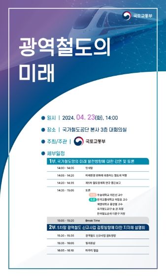[제주교통복지신문 박상현 기자] 국토교통부는 4월 23일 오후 2시 국가철도공단(대전)에서 「광역철도의 미래」 세미나를 개최한다.