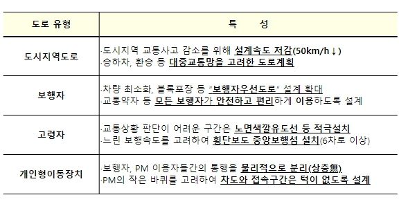 국토부에서는 보행자, 고령운전자, 개인형 이동장치(PM)의 안전환경을 고려하여 도로를 설계할 수 있도록 ’21년 3월 「사람중심도로 설계지침」을 제정한 바 있다.