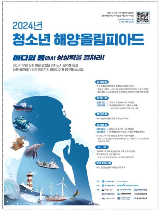 [제주교통복지신문 박상현 기자] 해양수산부와 한국해양재단(이사장 문해남) 등 해양수산분야 12개 기관은 국내 최초로 ‘청소년 해양올림피아드’를 개최하고, 5월 1일부터 6월 14일까지 참가신청을 받는다.