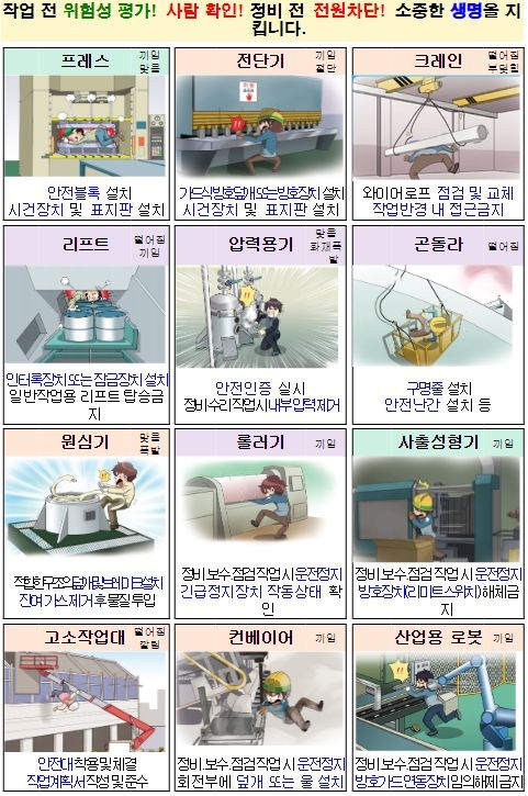 특히, 사업장이 미인증 기계·기구, 안전 인증·검사 기준 부적합 기계·기구를 사용하거나, 방호장치 없이 사용하는지 등을 철저히 확인하는 한편, 사업장에 기계‧기구의 정비 및 보수 등 작업 시 발생할 수 있는 사고를 미연에 방지하기 위한 핵심 안전수칙을 지도했다.