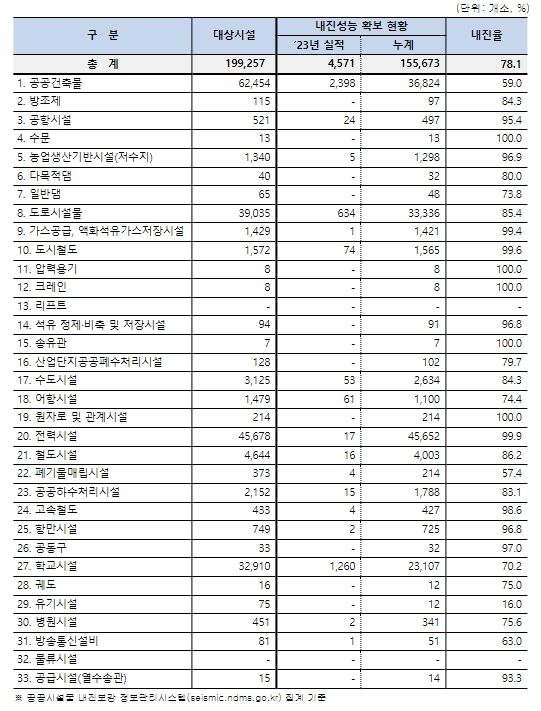 2023년도 내진보강대책 추진결과, 전국 기존 공공시설물 19만 9,257개소 중 15만 5,673개소가 내진성능을 확보하여, 내진율은 전년(75.1%)보다 3.0%p 증가한 78.1%를 기록했다. 이는 당초 목표한 76.5%보다 1.6%p를 초과 달성한 실적이다.