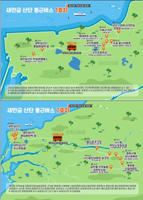 이 밖에 전주와 익산 노선은 출·퇴근 시간이 많이 소요되는 노선으로, 전주 노선은 1시간 40분 65km, 익산노선은 1시간 10분 52km의 운행거리로 새만금 산단의 에스씨, 천보비엘에스, OCI SE, 두산퓨얼셀 등의 근로자들이 이용하고 있다.