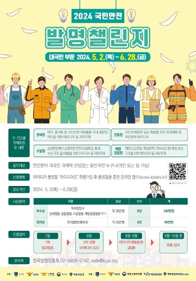 [제주교통복지신문 박상현 기자] 관세청은 특허청, 경찰청, 소방청, 해양경찰청과 함께 「2024 국민안전 발명챌린지」 대국민 부문* 아이디어 접수를 5월 2일부터 6월 28일까지 진행한다고 밝혔다.