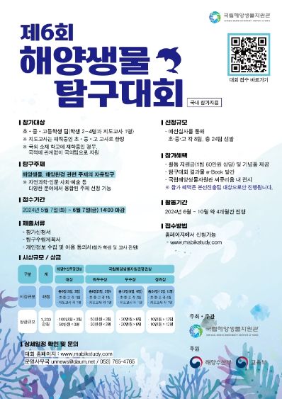[제주교통복지신문 박상현 기자] 청소년들에게 무궁무진한 가능성을 품은 ‘바다’를 과학적으로 탐색할 수 있는 기회를 제공하는 ‘제6회 해양생물 탐구대회’가 열린다. 이 대회는 해양수산부가 후원하고 국립해양생물자원관이 주최하며, 5월 7일부터 6월 7일까지 온라인으로 참가 접수를 받는다.