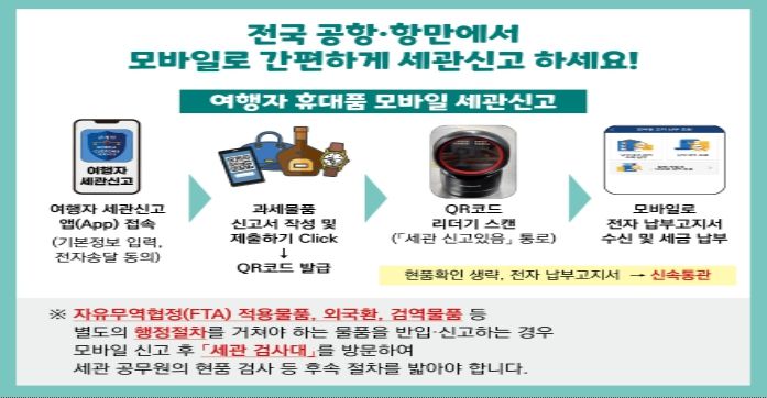 관세청은 지난 8월 「여행자 세관신고」 앱(App)을 개선해 그동안 일부 공항에서만 가능했던 ‘여행자 모바일 휴대품 신고 서비스’를 전국 공항만으로 확대*하고, 모바일로 신고한 후 세금 납부까지 가능하도록 ‘모바일 관세납부 시스템’을 구축했다.