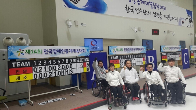 경기도 이천 대한장애인체육회 이천훈련원에서 열리고 있는 제14회 전국장애인동계체육대회 휠체어컬링 부문에서 제주도 장애인 선수단이 역사적인 첫승을 이뤄냈다.