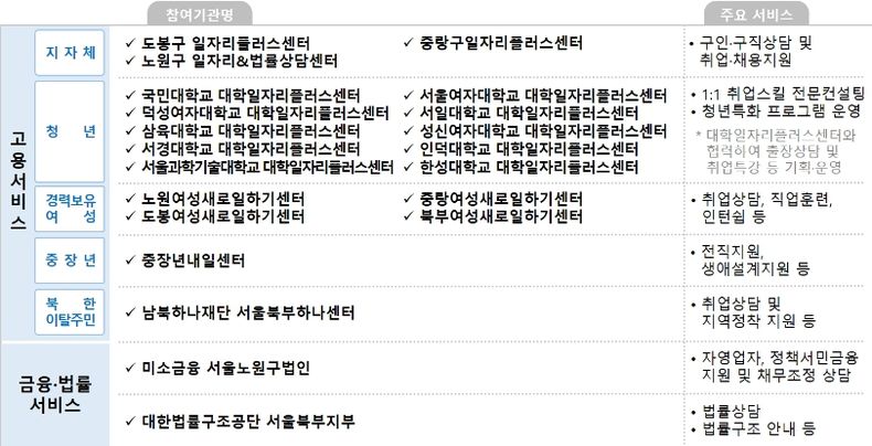 「고용서비스 통합네트워크」의 핵심은 유관기관 간 서비스 연계 활성화를 통해 취업‧채용지원을 강화하고 고용‧복지‧금융‧주거‧돌봄 등 취약계층의 복합적인 취업애로요인을 해소하는 것이다. 지자체, 새일센터 등 유관기관 협업체계에 기반해 지역 상황에 적합한 융합서비스를 지원한다.