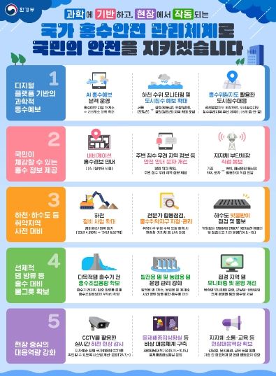 이번 대책은 국민 안전을 최우선 목표로 하여 “과학에 기반하고, 현장에서 작동되는 홍수 안전체계 마련”을 위해 △인공지능 홍수예보, △국민체감형 정보 제공, △취약지역 사전 대비, △홍수 대비 물그릇 확보, △현장 대응역량 강화 등 5가지 중점과제를 추진한다.