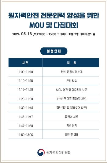 이날 행사에서 원안위와 협약(MOU)을 체결한 산학연관은 과학적 지식과 안전마인드를 갖춘 원자력안전 전문인력 양성의 필요성에 공감하고 원자력안전 전문인력 양성을 위해 상호 협력하기로 뜻을 모았다.