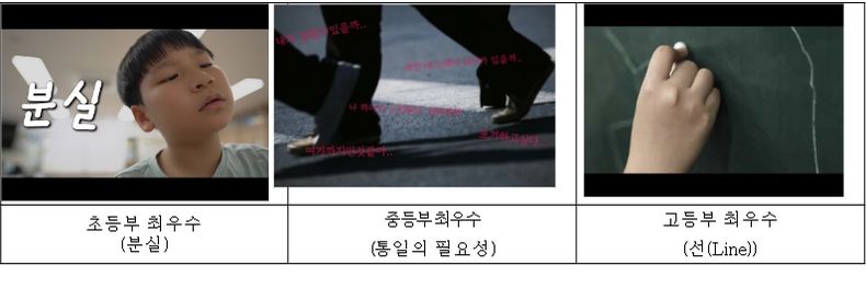 잃어버린 통일에 대한 마음을 찾아가는 과정을 통해 잃어버린 통일도 되찾을 수 있다고 상기시키고(초등부 최우수), 통일에 대한 관심을 가져달라고 부탁하기도 하며(중등부 최우수), 여러 종류의 선과 38선을 말하면서 통일을 염원하는 등(고등부 최우수) 다양하고 창의적인 방식으로 통일 문제를 이야기했다.