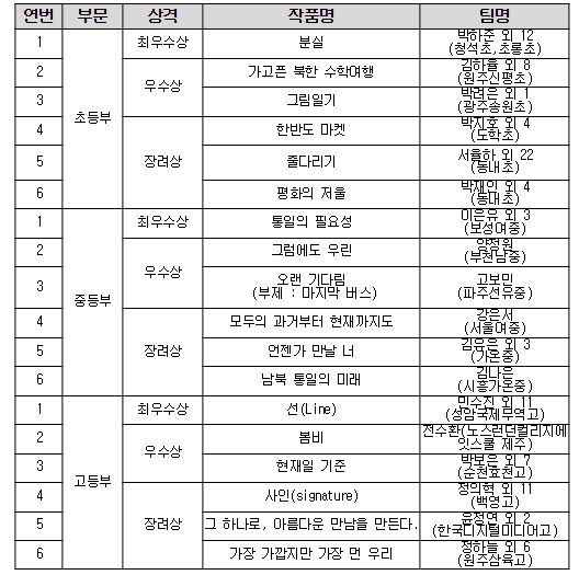 수상은 초·중·고등부 각각 최우수상(장관상) 1점, 우수상(교육원장상) 2점, 장려상 3점(교육원장상)이며, 수상작은 아래와 같다.