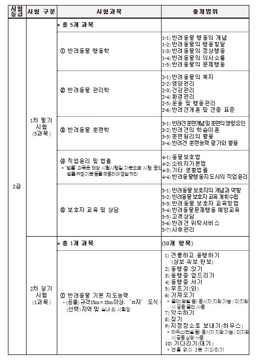 시험은 1차 및 2차 시험으로 구성되며, 1차 필기시험은 반려동물 행동학 등 5개 과목에 대해 선택형으로 시행된다. 2차 실기시험은 응시자 본인 또는 직계가족 소유 6개월령 이상의 반려동물과 동행하여 반려동물 기본 지도능력을 평가한다. 올해는 2급 시험만 시행되며, 2급 시험의 응시자격은 18세 이상이다.
