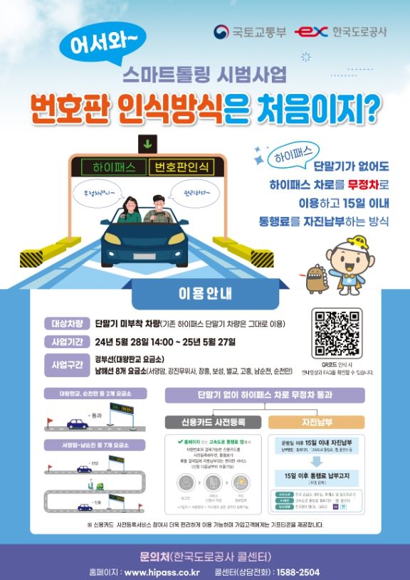 국토교통부는 5월 28일부터 1년간 일부 구간*에 번호판 인식방식의 무정차 통행료 결제 시범사업을 추진한다.