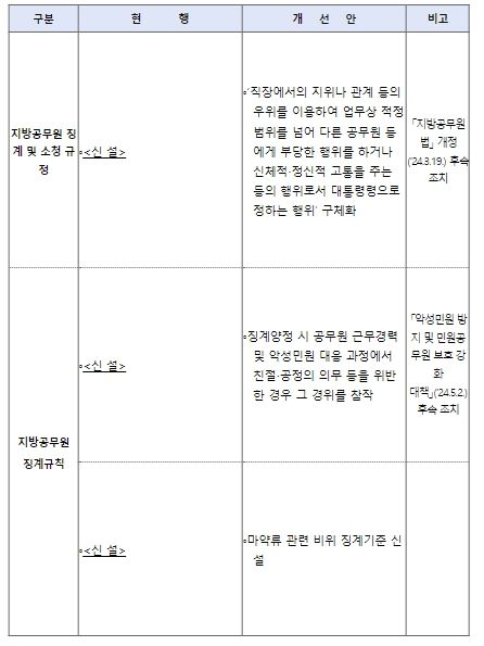 마지막으로, '지방공무원법' 개정에 따라 직장 내 우월적 지위·관계를 이용하여 신체적·정신적 고통을 주는 갑질 행위의 피해자도 징계처분 결과를 통보받을 수 있게 되면서, ‘갑질’ 행위를 구체화하는 등 입법이 필요했던 부분도 함께 개선한다.