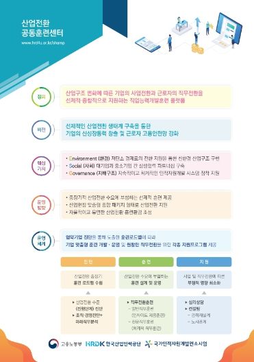 산업전환 공동훈련센터는 미래차 등 저탄소 전환에 따라 대기업·대학 등의 훈련 기반시설을 활용해 △ 체계적인 기업 진단, △ 실습 중심의 직무전환훈련, △ 심리상담 등 사후관리 프로그램을 제공한다. 이를 통해 기업의 사업전환과 근로자의 직무전환을 선제적‧종합적으로 지원한다.