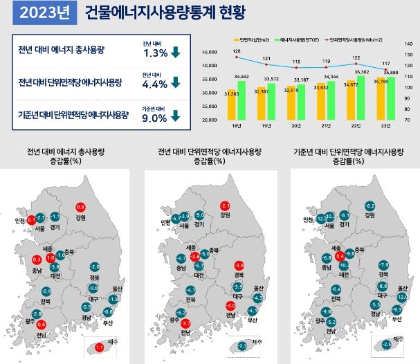 [제주교통복지신문 박상현 기자] 국토교통부는 '23년 전국 모든 건물의 에너지사용량을 집계한 결과, 에너지 총사용량과 단위면적당 에너지사용량이 전년 대비 각각 1.3%, 4.4% 감소했으며, 기준년('18년) 대비 단위면적당 사용량은 9.0% 감소했다고 밝혔다.