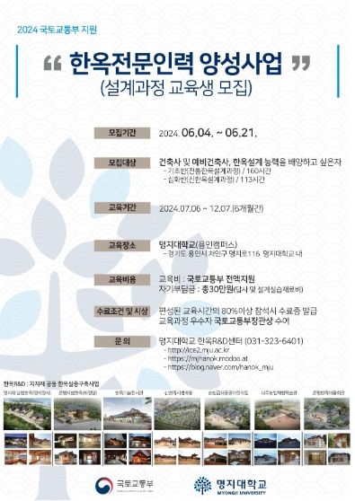 이번 한옥 전문인력 양성사업은 한옥 설계와 한옥 시공관리자 두 가지 과정으로 이뤄졌으며, 교육기관으로 선정된 명지대와 전북대는 7월부터 한옥 설계 및 시공 교육과정을 운영한다.