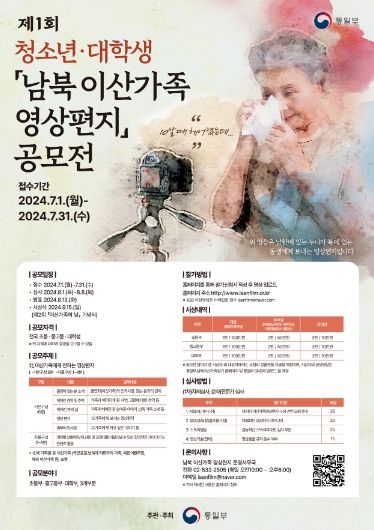 [제주교통복지신문 박상현 기자] 통일부는 젊은 세대들이 분단과 이로 인한 이산가족들의 아픔을 이해하고 공감할 수 있도록 청소년과 대학생이 직접 참여하는'이산가족 영상편지 공모전'을 진행한다고 밝혔다.