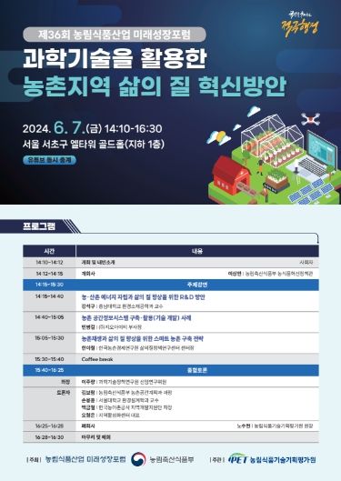 [제주교통복지신문 박상현 기자] 농림축산식품부는 “과학기술을 활용한 농촌지역 삶의 질 혁신방안”을 주제로 하는 「제36회 농림식품산업 미래성장포럼」을 6월 7일 서울 엘타워에서 개최한다.