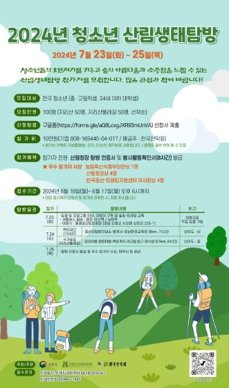 [제주교통복지신문 박상현 기자] 산림청은 오는 7월 23일부터 25일까지 진행되는 ‘청소년 산림생태탐방’의 참가자를 모집한다고 11일 밝혔다.