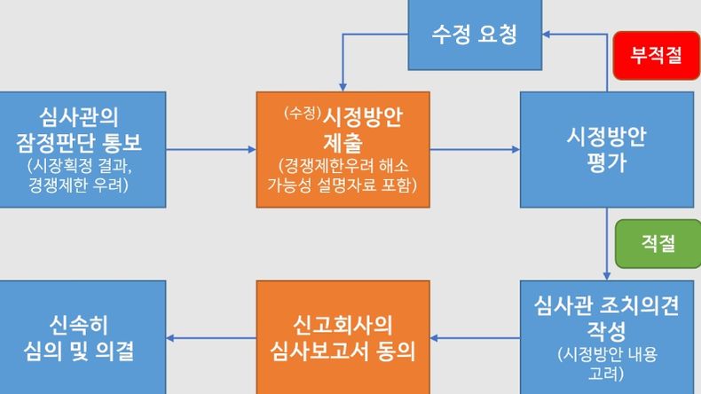 기업은 통보받은 경쟁제한 우려를 해소할 수 있는 시정방안을 문서로 제출할 수 있으며, 그 시정방안이 경쟁제한 우려를 효과적이고도 적기에 해소할 수 있으며 빠르게 이행 가능하다는 점에 대한 설명자료도 함께 제출할 수 있다.