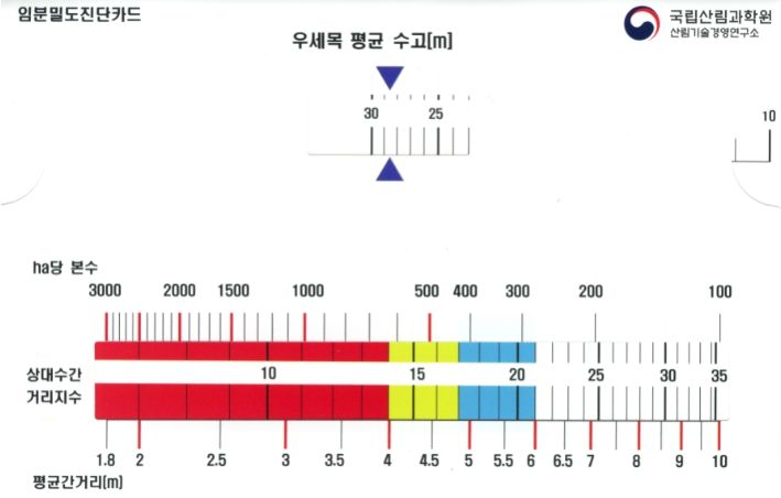 이번에 산림기술경영연구소가 개발한 임분밀도진단카드는 해당 숲의 나무 높이와 밀도를 이용해 현장에서 간편하게 솎아베기 작업 시행 여부를 결정할 수 있도록 했다.