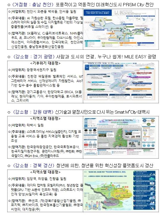 ‘거점형’은 도시문제 해결을 위한 종합 솔루션을 개발ㆍ실증하여 스마트도시 확산을 이끌어 갈 스마트 거점을 조성하고, ‘강소형’은 기후위기ㆍ지역소멸 등 환경변화에 대응력을 확보하기 위한 특화 솔루션이 집약된 도시를 조성하는 사업이다.