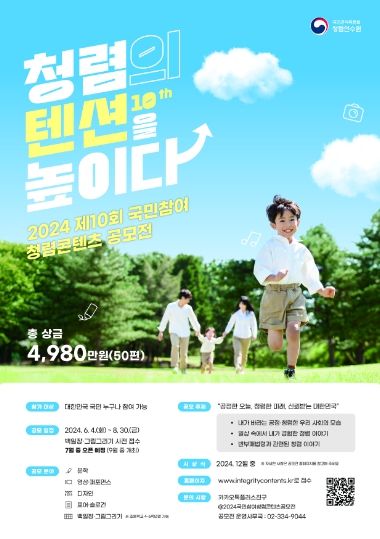 [제주교통복지신문 박상현 기자] 국민권익위원회 소속 청렴연수원은 국민과 함께 청렴문화를 확산시키고자 지난 6월 4일부터 8월 30일까지 ‘제10회 국민참여 청렴콘텐츠 공모전’을 개최하고 있다.