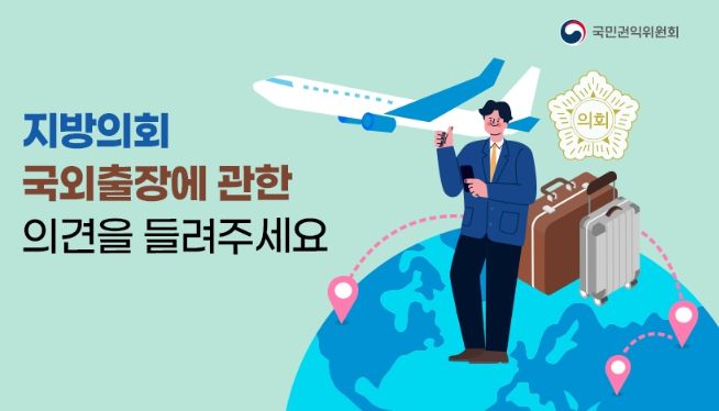 [제주교통복지신문 박상현 기자] 국민권익위원회는 지방의회 의원의 국외출장 개선방향에 관하여 설문조사 방식으로 국민 의견을 수렴한다.