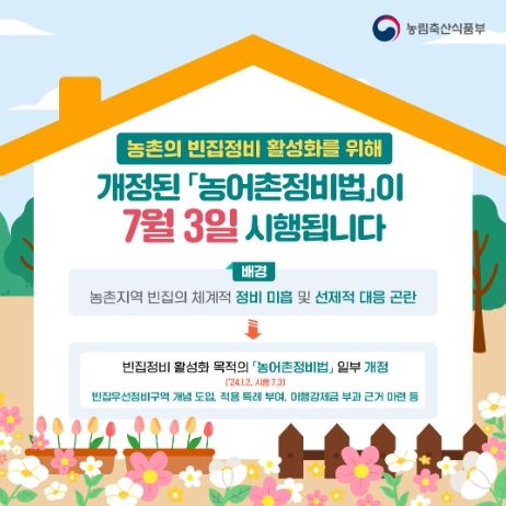 [제주교통복지신문 박상현 기자] 농림축산식품부는 지난 1월'농어촌정비법'일부 개정으로 도입된 농촌 빈집우선정비구역 지정 제도와 특정빈집 이행강제금 부과 등이 7월 3일부터 시행되며, 이로써 민간의 자발적 빈집 정비 유도와 민간 빈집 활용 확대를 병행하는 농촌 빈집 투 트랙(two-track) 정책이 본격 추진된다고 밝혔다.
