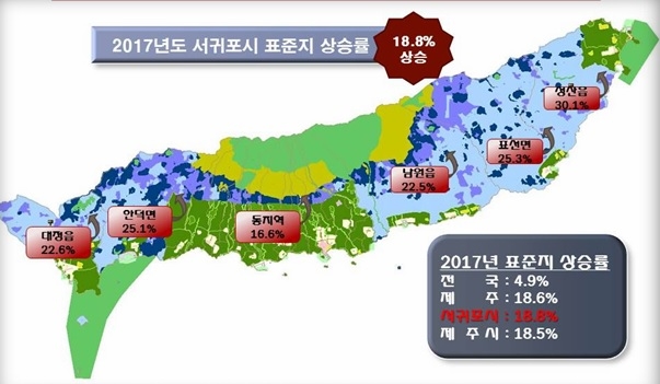 22일, 국토교통부가 발표한 자료에 따르면 서귀포시의 표준지 공시지가는 전년 대비 18.8% 상승했으며, 이는 전국 평균(4.9%)은 물론 제주 평균(18.6%)를 넘어선 것이다.