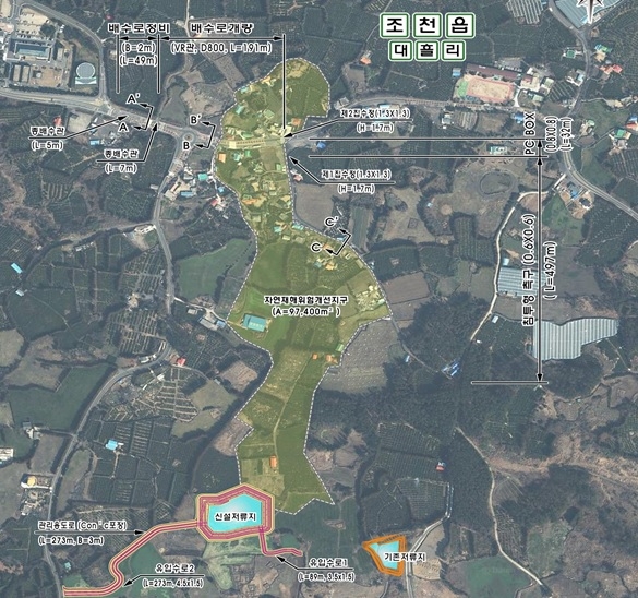 조천읍 대흘1리는 중산간 상류부에서 발생된 우수가 저지대 주거지역으로 집중 유입되는 지형적 특성을 갖고 있어 2007년 태풍 '나리'와 2011년 집중호우 당시 주택 12동과 농경지 6ha가 침수피해를 입음에 따라 2013년 자연재해위험개선지구로 지정된 바 있다.
