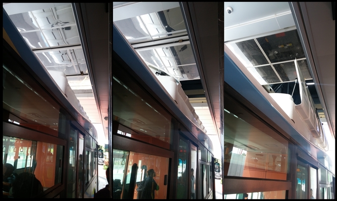 ▲ 정류장에 들어선 전기버스의 배터리가 설치된 상부가 자동으로 열리고 있다